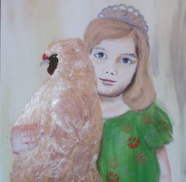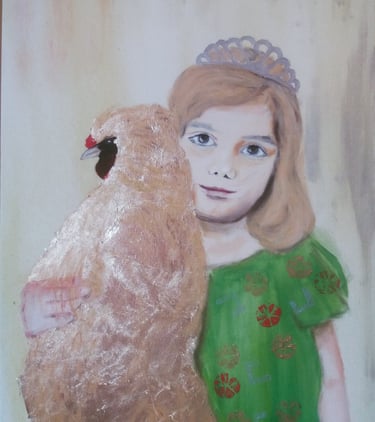 Matilda met gouden kip, olieverf en goudblad op doek, 50x70 cm, privé collectie