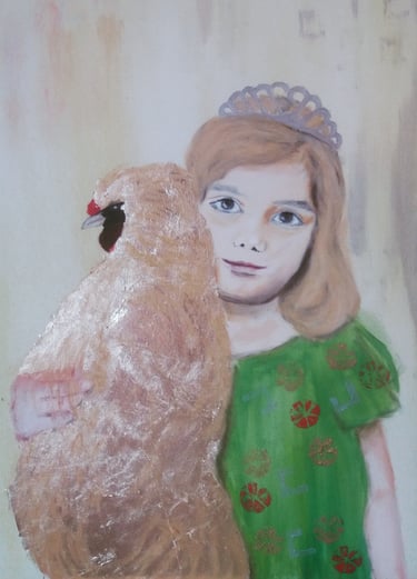 Matilda with gold chicken, oil on canvas, gold blad, 50x70 cm, private collection